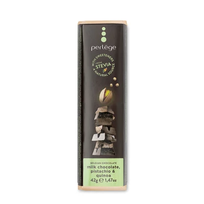 Hozzáadott cukor nélkül készült, szítviával édesített tejcsokoládé pisztáciával és quinoával.