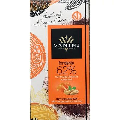 A VANINI Étcsokoládé karamellizált kesudióval és kandírozott narancshéjjal egy igazán különleges ízélményt nyújtó termék.